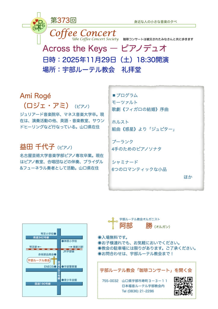 11月の珈琲コンサートは「Across the Keys 」と題してピアノデュオの演奏です。